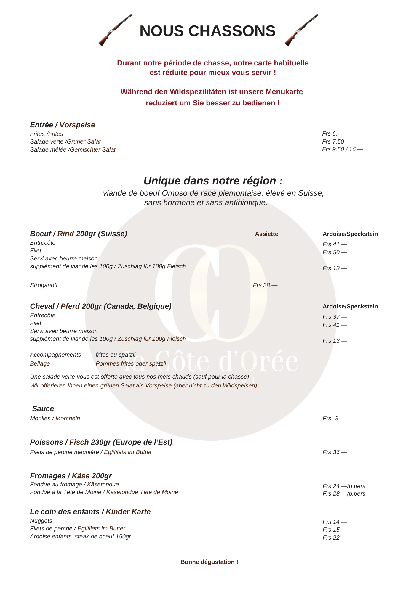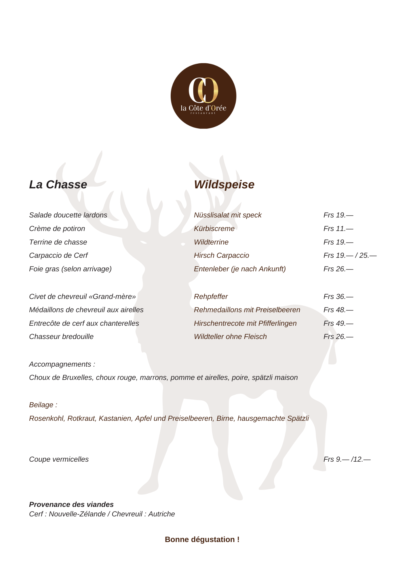 Le restaurant La Côte d’Orée est heureux de vous annoncer le retour de sa traditionnelle carte de chasse. Du 19 septembre au 30 novembre, venez savourer des plats authentiques et savoureux, préparés avec des produits de saison.